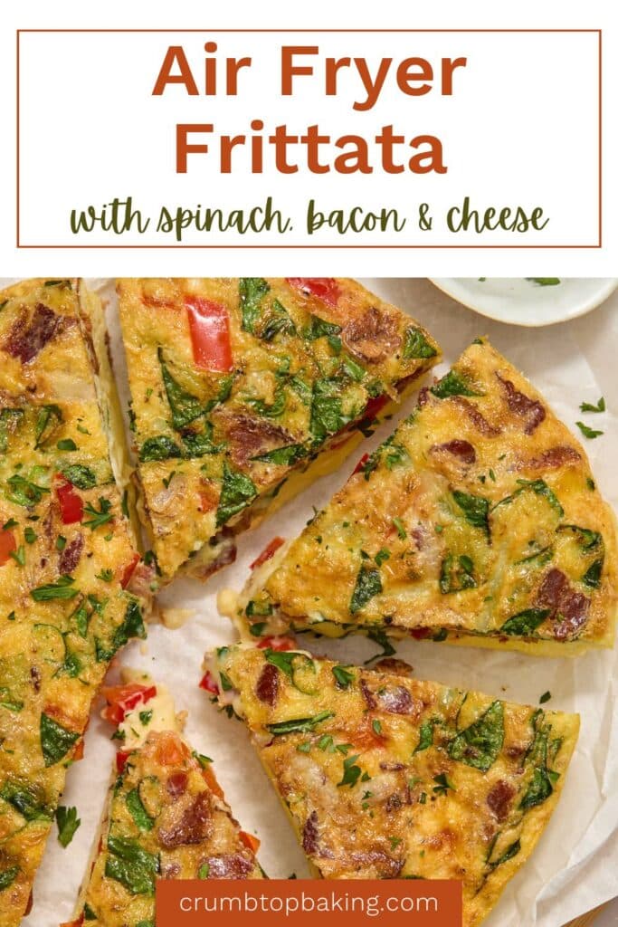 This Air Fryer Frittata is creamy and fluffy and filled with spinach, bacon and Swiss cheese! It's quick to assemble and hands off as it cooks in the air fryer. It's perfect for brunch or lunch with a salad or home fries!