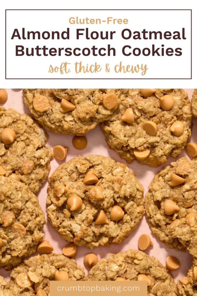 Soft, thick and perfectly chewy, these Almond Flour Oatmeal Butterscotch Cookies are loaded with old fashioned rolled oats, butterscotch chips and a hint of cinnamon. They're gluten-free, made with almond flour, coconut flour and brown sugar, and require zero chilling time. They bake up soft and tender in the middle and crispy around the edges. The recipe makes a batch of 24 cookies, and they keep for a number of days at room temperature and freeze well too.