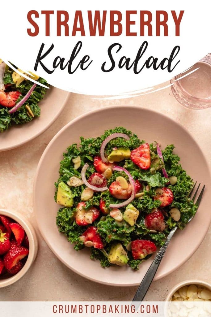 This Strawberry Kale Salad is filled with juicy strawberries, hearty kale, creamy avocado and topped with an easy poppyseed dressing. It works as a simple side salad or add a protein to make it an entrée!